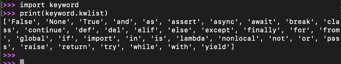 Kode di atas akan menampilkan daftar lengkap kata kunci yang digunakan dalam versi Python yang sedang berjalan (LIHAT DIBAWAH INI)